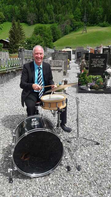 Selter Anblick: unser Obmann beim Auftritt der Harmoniemusik im Anzug und am Schlagzeug. Grund dafür war, dass sein Sohn David zur Firmung kam.